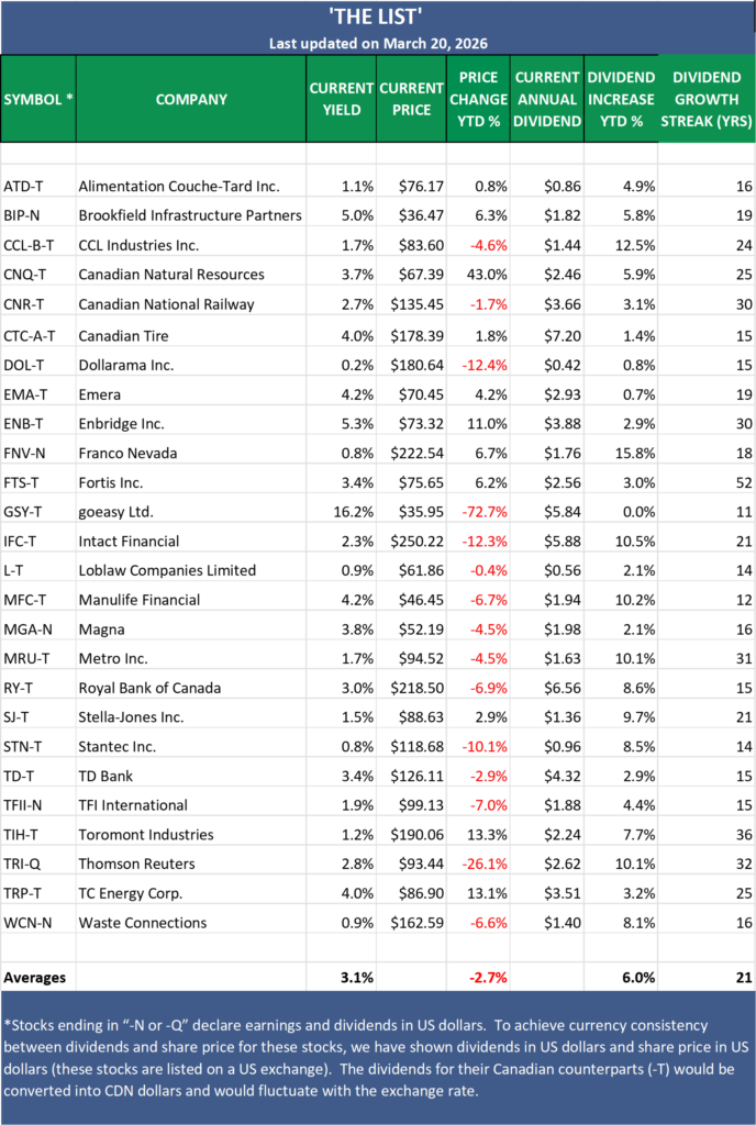 The Magic Pants 2026 list (The List) includes 26 Canadian dividend growth stocks and our new American watchlist (The List-USA) contains 28 companies. Here are the criteria to be considered a candidate on our watchlists: